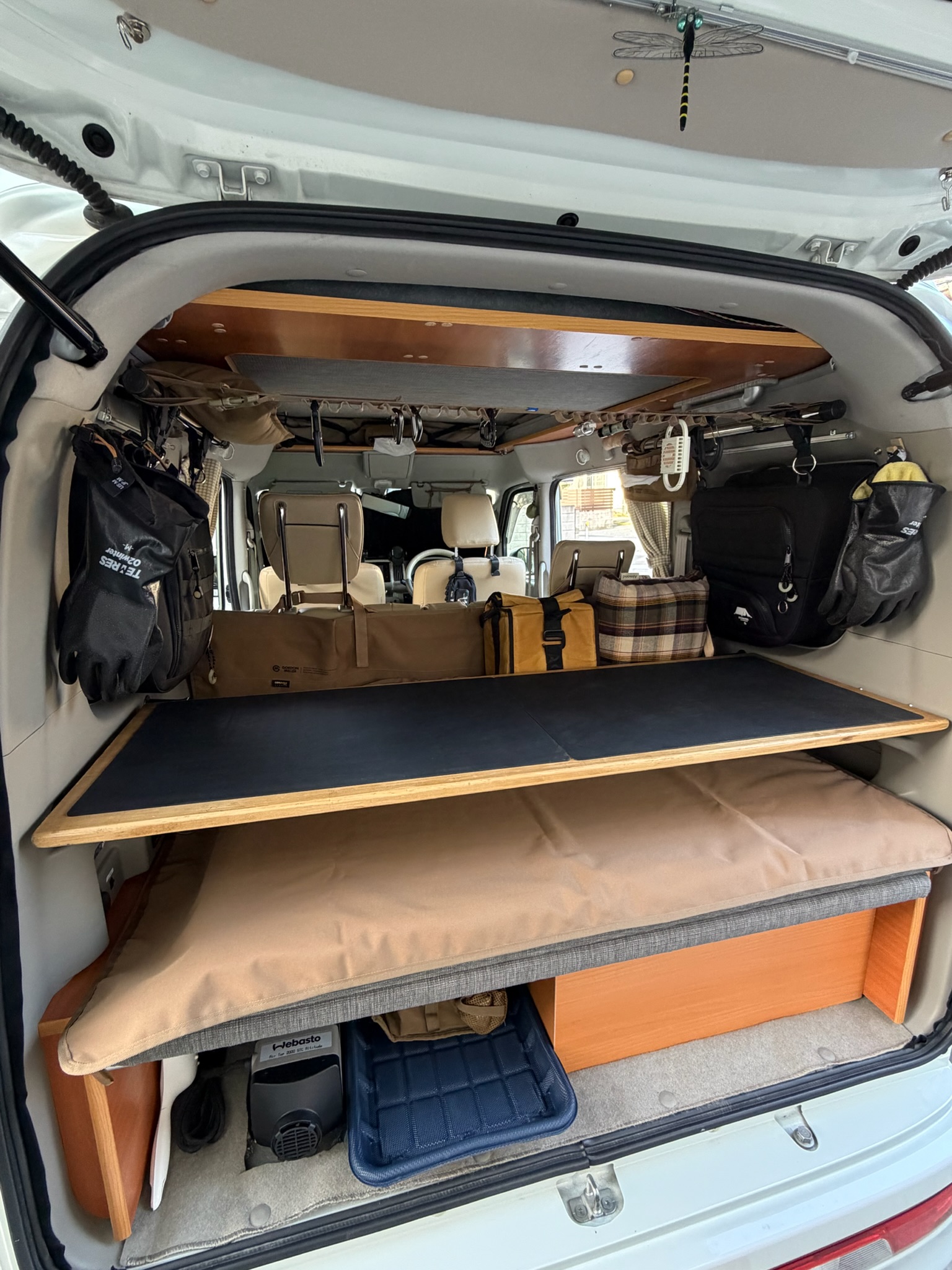 ラゲッジボードステーに差し込んで設置。ボードの下にはマットレスとFFヒーターを収納し、上には荷物や小物を置けます。ベッド展開時に荷物を移動する必要がなく、就寝準備が格段にラクになりました。