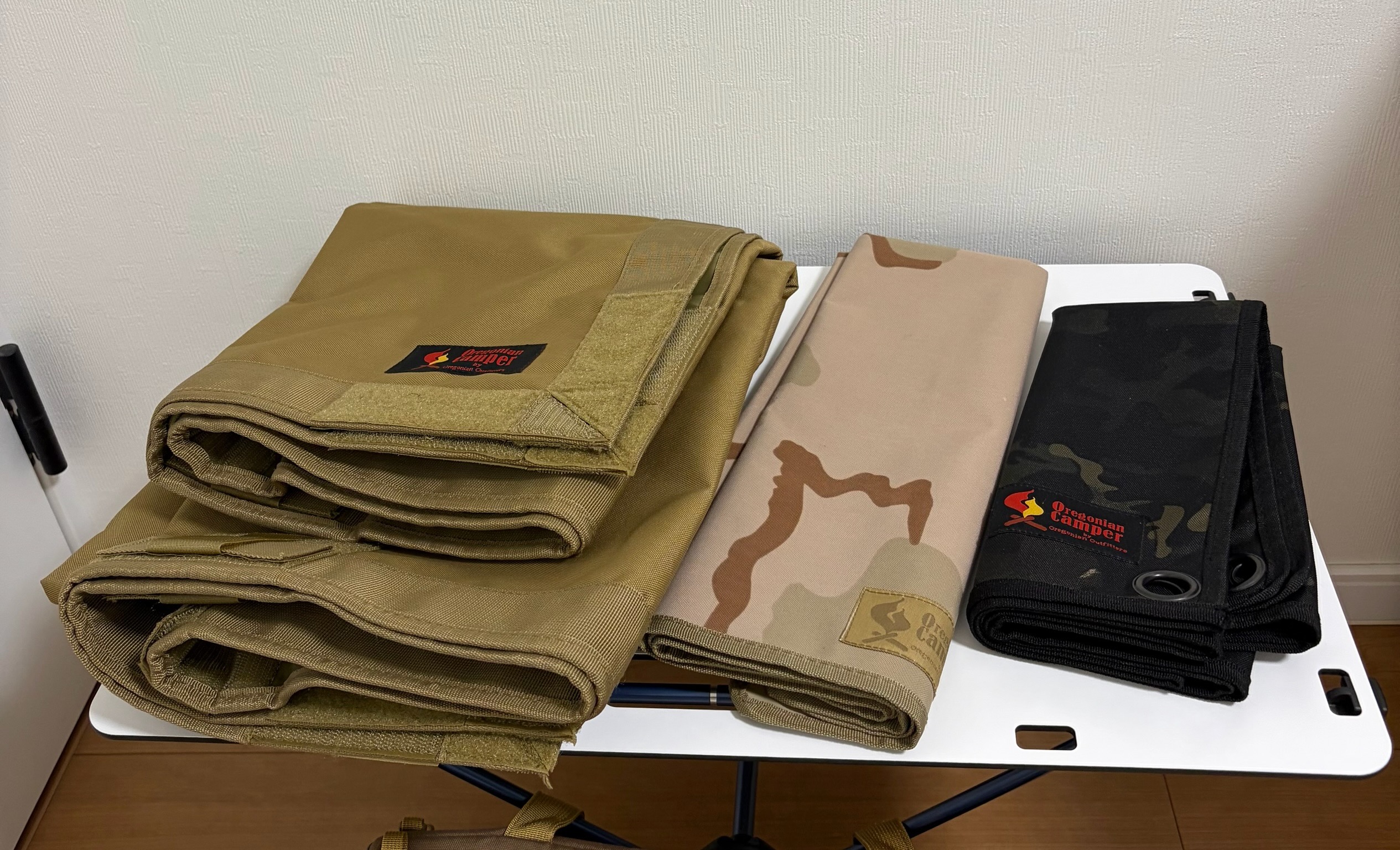 我が家がずっと使っているのがオレゴニアンキャンパーのグランドシート。カモ柄のデザインが渋くて、キャンプサイトに置いても浮かない。サイズ違いで3種類を揃えて、場面に合わせて使い分けています。